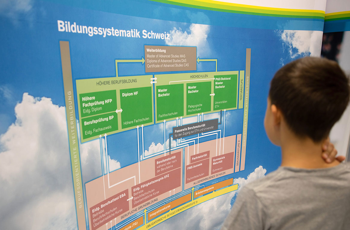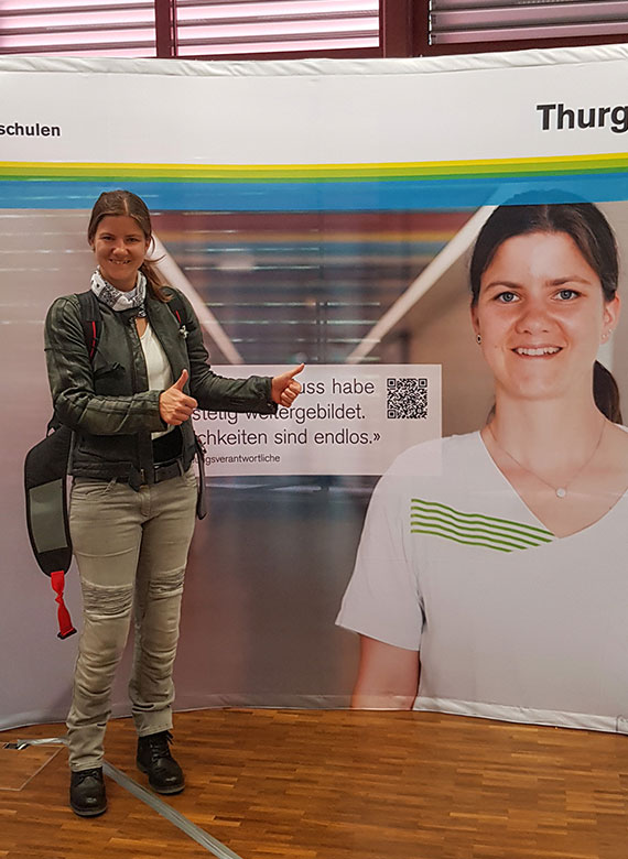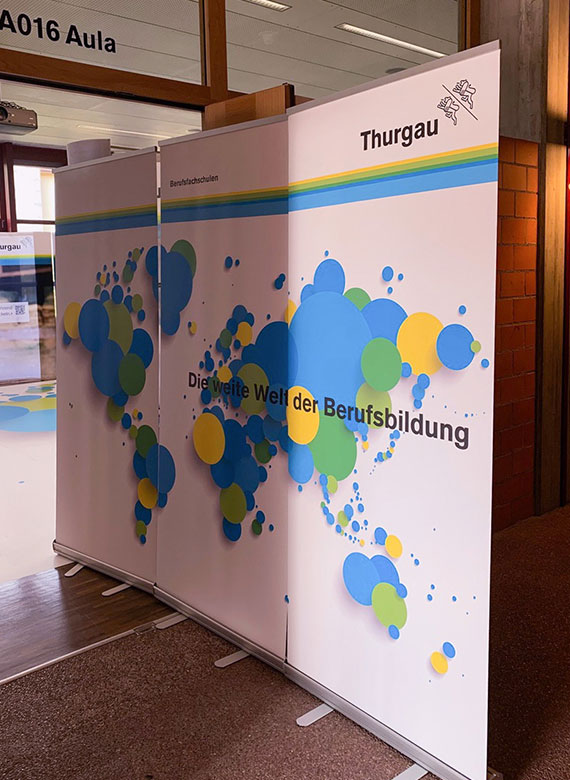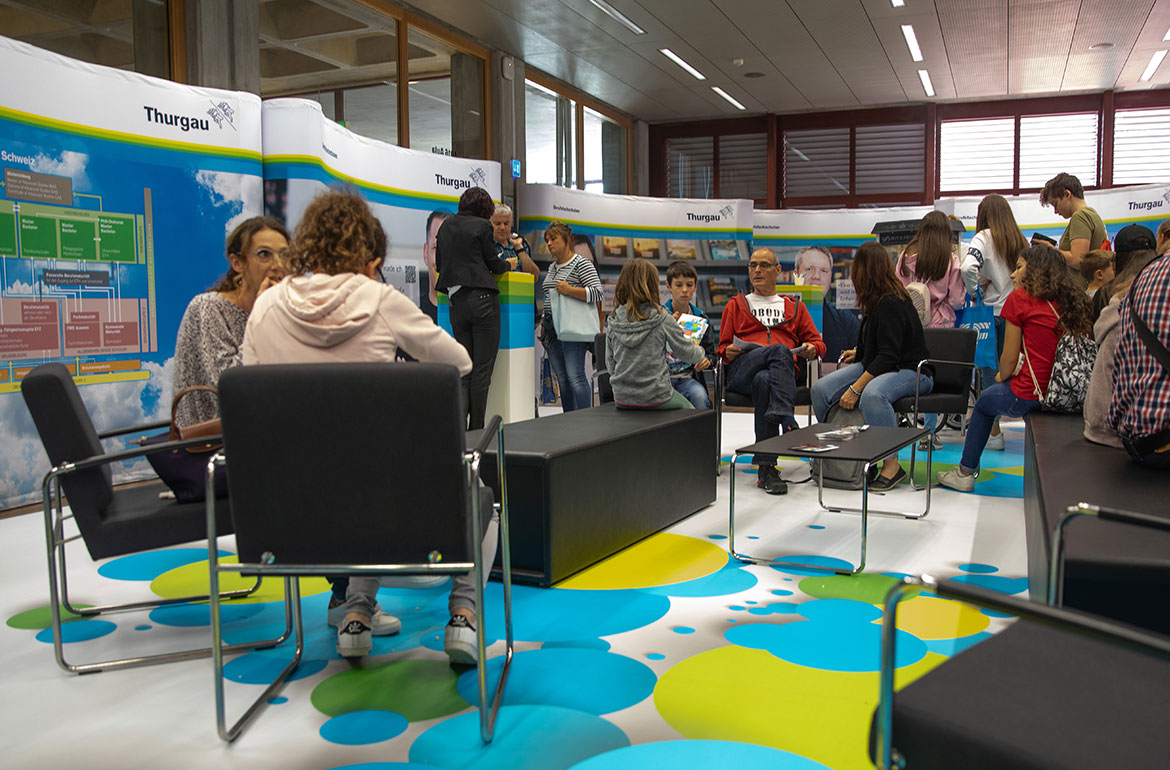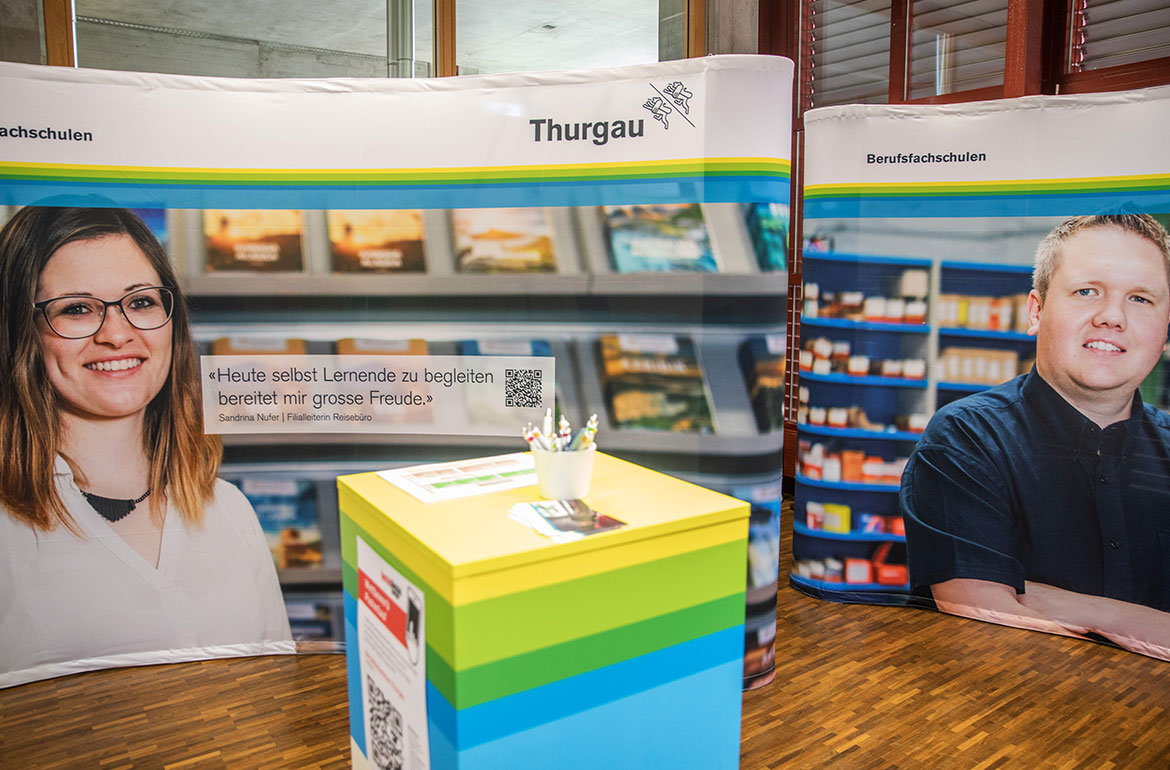 Nachdem die Berufsfachschulen des Kantons Thurgau an der Berufsmesse jahrelang zwar in einem Raum, aber mit einzelnen Ständen vertreten waren, entschied man sich 2019 zu einem gemeinsamen Messeauftritt, um den jungen Schülerinnen und Schülern die Vorzüge der Berufslehre näher zu bringen. Die Auswahl an Berufen wie auch die Weiterbildungsmöglichkeiten nach erfolgreichem Lehrabschluss sind sehr breit – entsprechend lautete das Motto des Messeauftritts «die weite Welt der Berufsbildung».