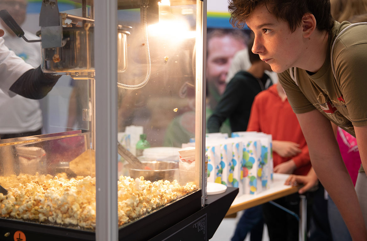 Im Vorfeld haben wir Absolventen und Absolventinnen der Berufsfachschulen interviewt, die von ihrem Weg berichteten und deutlich machten, wieso sich eine Lehre lohnt und wie viele Türen sie öffnen kann. Es entstanden Video-Portraits, die auf die Website zum Messeauftritt geladen wurden, aber auch an der Messe selbst durch das Scannen eines QR-Codes angesehen werden konnten. Am Messestand lag den Besucherinnen und Besucher dank einer Bodenbeklebung wortwörtlich die Welt zu Füssen und wer nicht ohnehin bereits an einer Lehre interessiert war, den lockte der Geruch von frischem Popcorn bestimmt an den Stand der Berufsfachschulen Thurgau.