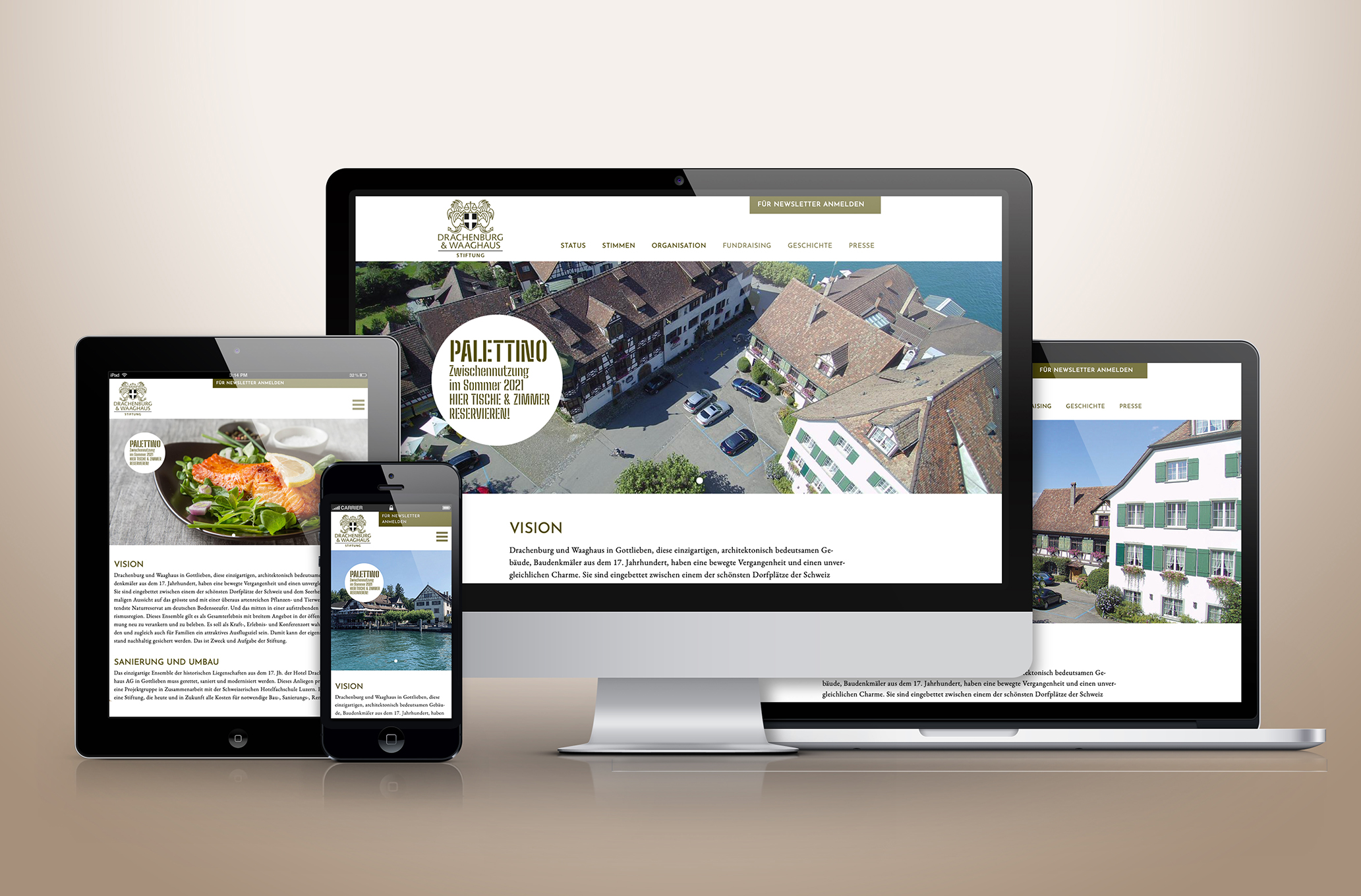 In Gottlieben, direkt am Ufer des Untersees, stehen zwei einzigartigen Baudenkmäler aus dem 17. Jahrhundert. Drachenburg und Waaghaus haben eine bewegte Vergangenheit und einen unvergleichlichen Charme. Mit einem gross angelegten Bauprojekt sichert die Stiftung Drachenburg und Waaghaus eine Zukunft für die Hotellerie- und Gastronomiebetriebe. Wir durften das Corporate Design und die Webseite der Stiftung gestalten.