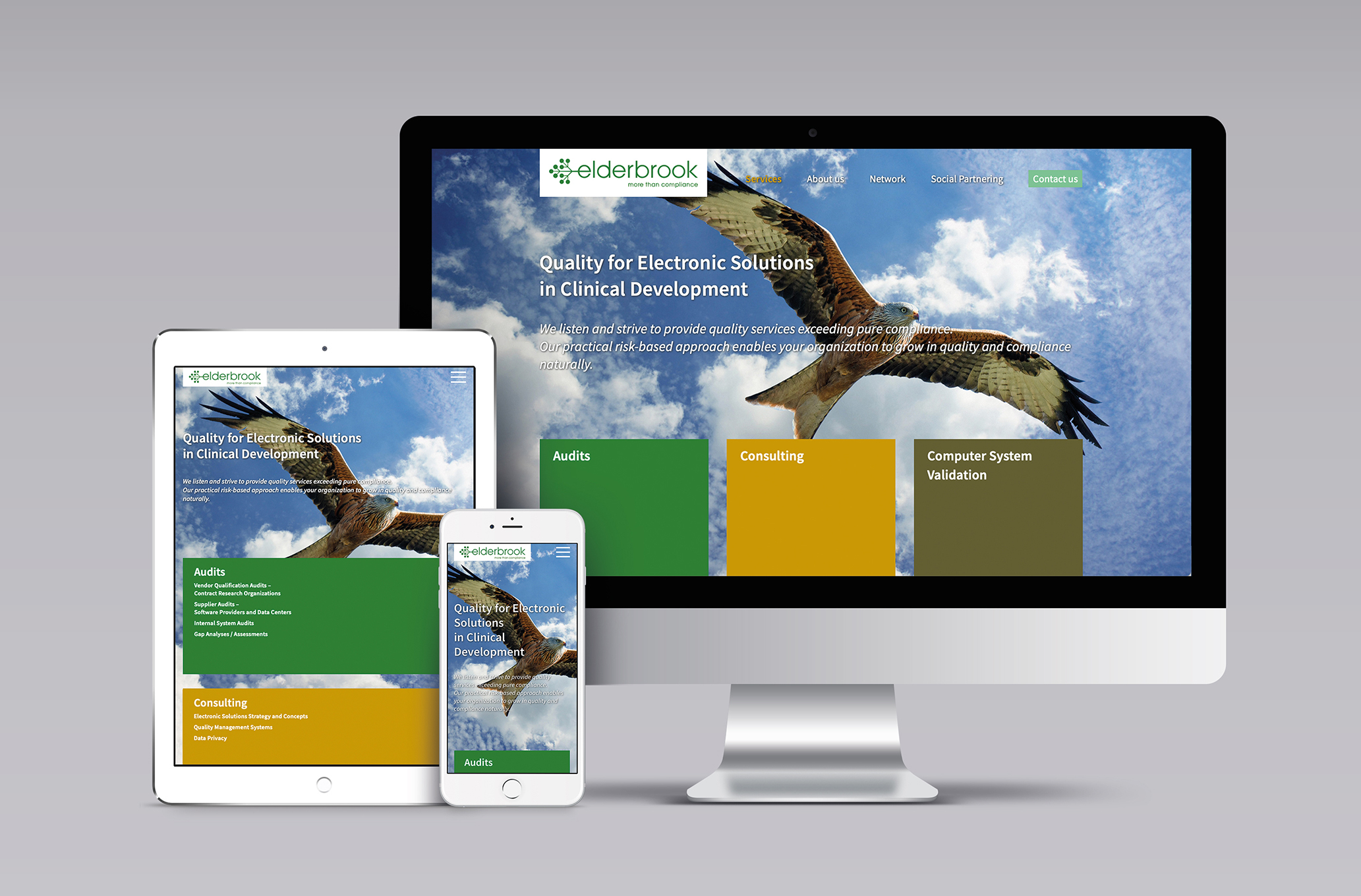 Elderbrook Consulting erbringt weltweit Dienstleistungen für die Pharma- und Medizinprodukteindustrie. Der Fokus liegt auf elektronischen Lösungen zur klinischen Entwicklung im Audit- und Compliancebereich. Für das spannende Unternehmen durfte Komthur den Markenauftritt inklusive Logo und Webseite konzipieren und gestalten.