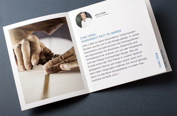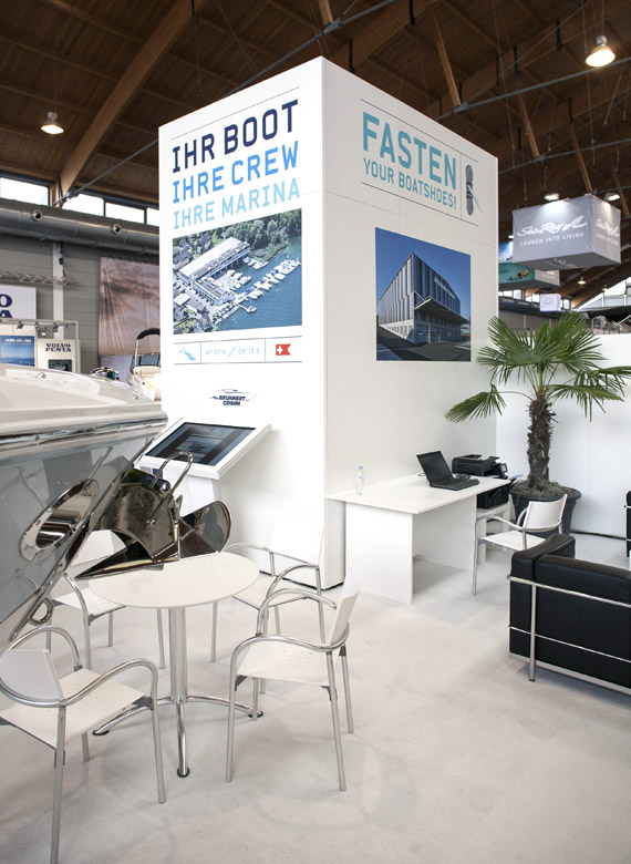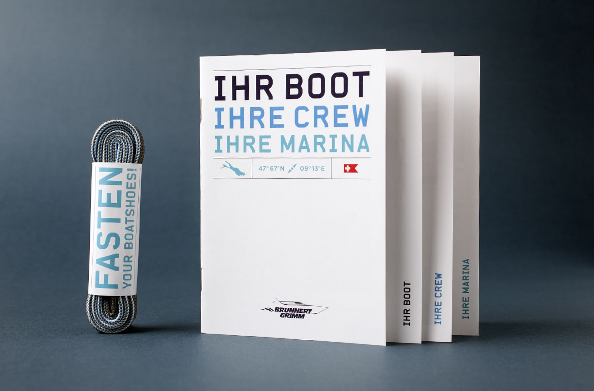 Die Brunnert-Grimm AG ist Schweizer Importeurin der finnischen Werft Grandezza. Die Weltpremiere der schnittigen Boote Grandezza 25 und 28 auf der Interboot sollte gebührend inszeniert werden. Mit dem Motto «Fasten Your Boatshoes» wurden die Messebesucher auf die beiden Neuheiten aufmerksam gemacht. Passenderweise gab es als Give-Away ein Paar farbige Schuhbändel für die Bootsschuhe. Wir zeichneten für die Messeeinladung, für Inserate in Fachmagazinen, für das Give Away, für ein Image-Booklet und für die Beschriftung des Messestandes verantwortlich.