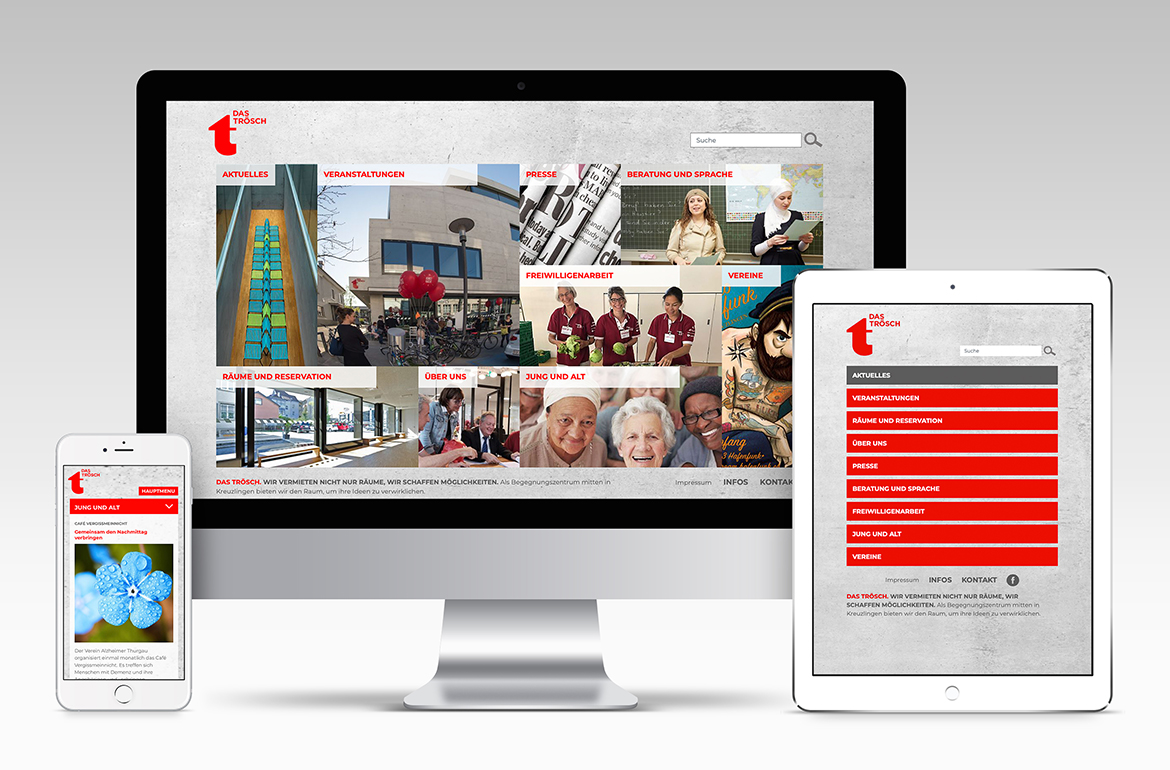 Das Begegnungszentrum DAS TRÖSCH steht als Treffpunkt den Kreuzlingerinnen und Kreuzlingern zur Verfügung, stärkt dadurch das gesellschaftliche Miteinander und trägt zur sozialen Integration bei. Komthur durfte die Webseite und das Corporate Design von DAS TRÖSCH gestalten und so einen Beitrag zum Miteinander in Kreuzlingen leisten.