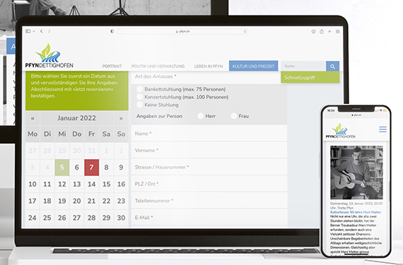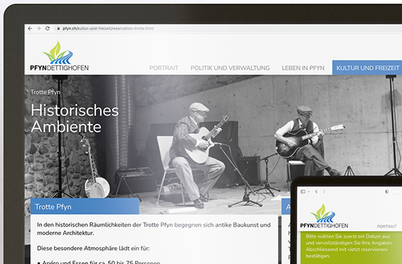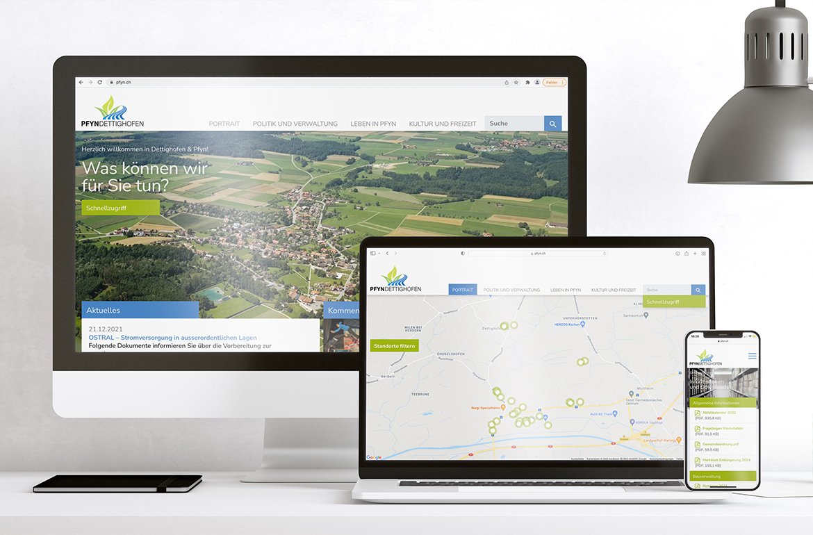 Der Webauftritt einer politischen Gemeinde ist eine komplexe Sache. Es gilt eine Vielzahl von Informationen übersichtlich zu präsentieren – und jede Gemeinde ist anders. Wir begleiteten die Gemeinde Pfyn bei der Konzeption, definierten gemeinsam Inhalte und Struktur und konzipierten so eine massgeschneiderte Webseite. Highlights sind der interaktive Ortsplan, ein Raum-Reservationstool, das Veranstaltungsregister mit Login, sowie eine digitale Plattform für Gewerbe und Vereine.