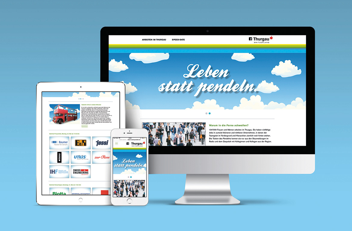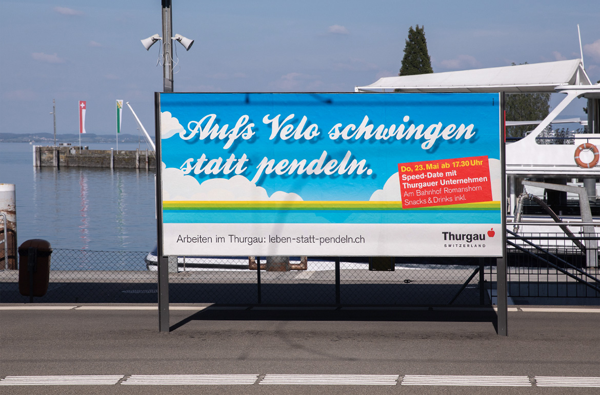 Rund 45'000 Thurgauerinnen und Thurgauer pendeln an einen Arbeitsort ausserhalb des Kantons. Volkswirtschaftlich ist das ein Verlust, dem der Kanton entgegenwirken will. Aus diesem Grund beauftragte er uns, das Konzept für eine Marketingoffensive zum Arbeitsstandort Thurgau zu entwickeln. Gemeinsam mit den Mitarbeitenden des AWA identifizierten wir in Workshops die Kernargumente und Zielgruppen. Das führte uns zur Kampagne «Leben statt pendeln», mit der wir aufzeigen, wie die Lebensqualität und Work-Life-Balance durch die Wahl einer Arbeitsstelle im Kanton gesteigert werden kann.
