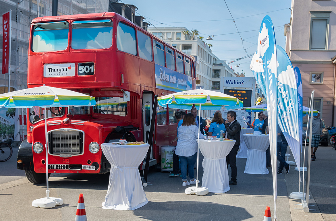 Schwerpunkte der Kampagne waren eine fokussierte Plakat- und Facebook-Kampagne und eine aufmerksamkeitsstarke Promotion: ein plakativ gestalteter London Bus lud zum besonderen Speed-Date. An Bord waren Unternehmerinnen und Unternehmer, die an vier aufeinanderfolgenden Abenden in Frauenfeld, Kreuzlingen, Weinfelden und Romanshorn jeweils im Sieben-Minuten-Takt bei Pendlerinnen und Pendlern für den Werkplatz Thurgau warben. Die Events sowie die ganze Kampagne sind ein voller Erfolg und trafen auf grosses Medieninteresse. Die Kampagne wird weitergeführt.
