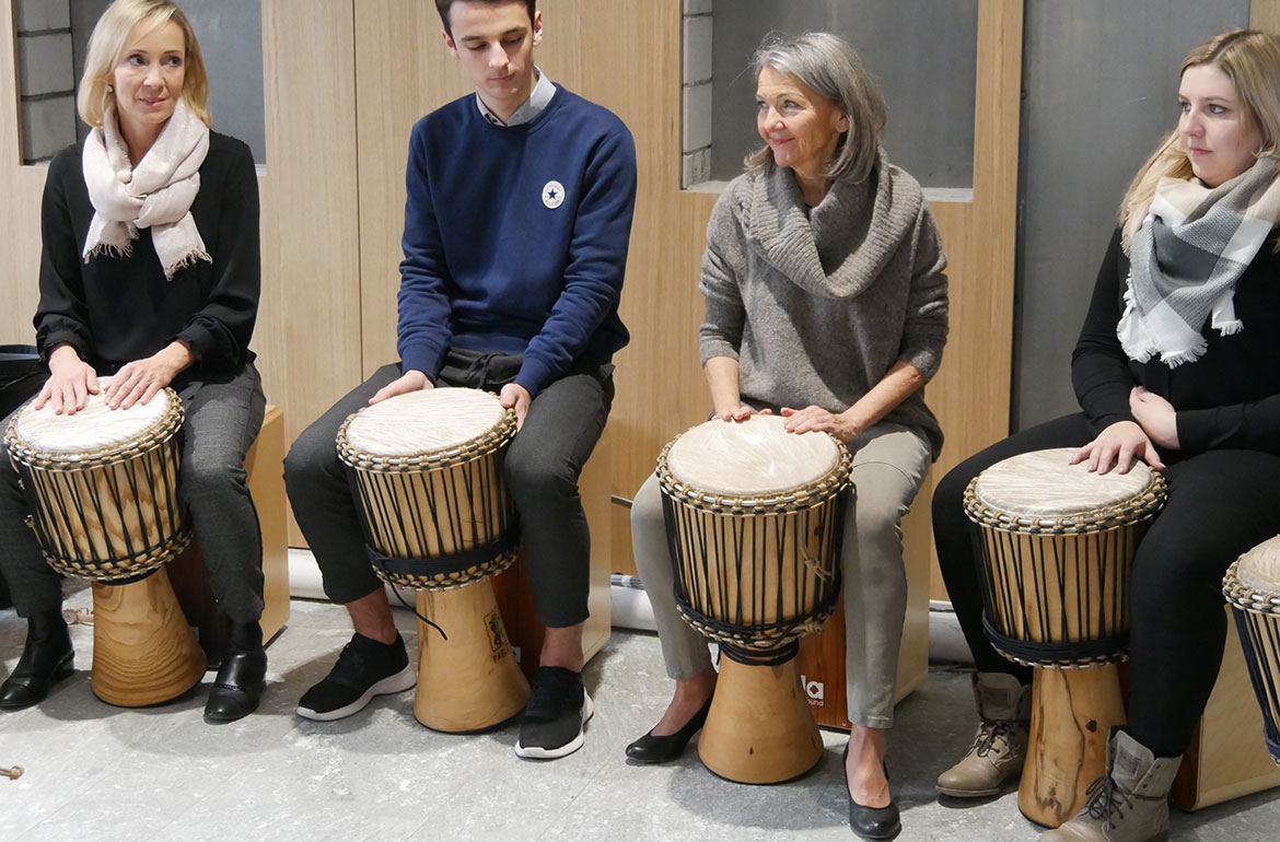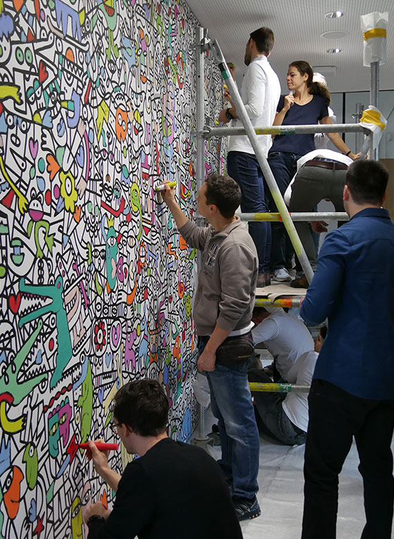 Ein gutes Jahr später waren die Mitarbeitenden an der Reihe. Der Zürcher Künstler «Fredinko» bereitete im Beratungsbereich des neuen Bankgebäudes ein Wimmelbild vor, das vom Team im Rahmen eines Mitarbeiteranlasses farbig ausgestaltet wurde. Und wer nicht gerade den Neubau verschönerte, konnte in einem Perkussionskurs unter der Leitung von Samuel Forster an seinem Rhythmusgefühl arbeiten.