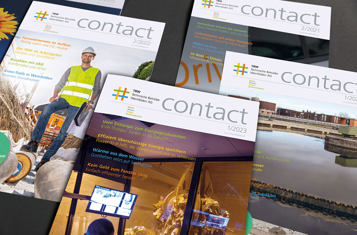 Magazine sind ein ausgezeichnetes Mittel, um mit den Kunden in Kontakt zu bleiben und eine Bindung aufzubauen. Vorausgesetzt, sie sind informativ, gut lesbar und laden die Marke mit Werten auf. So wie «contact», das Kundenmagazin der Technische Betriebe Weinfelden AG. Zweimal jährlich erarbeitet Komthur gemeinsam mit der TBW die Themen, recherchiert diese selbstständig, führt Interviews, schreibt die Texte, fotografierte gestatet4 das Heft und setzt es um.