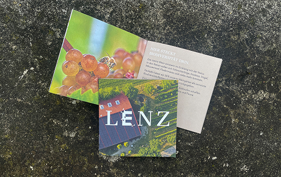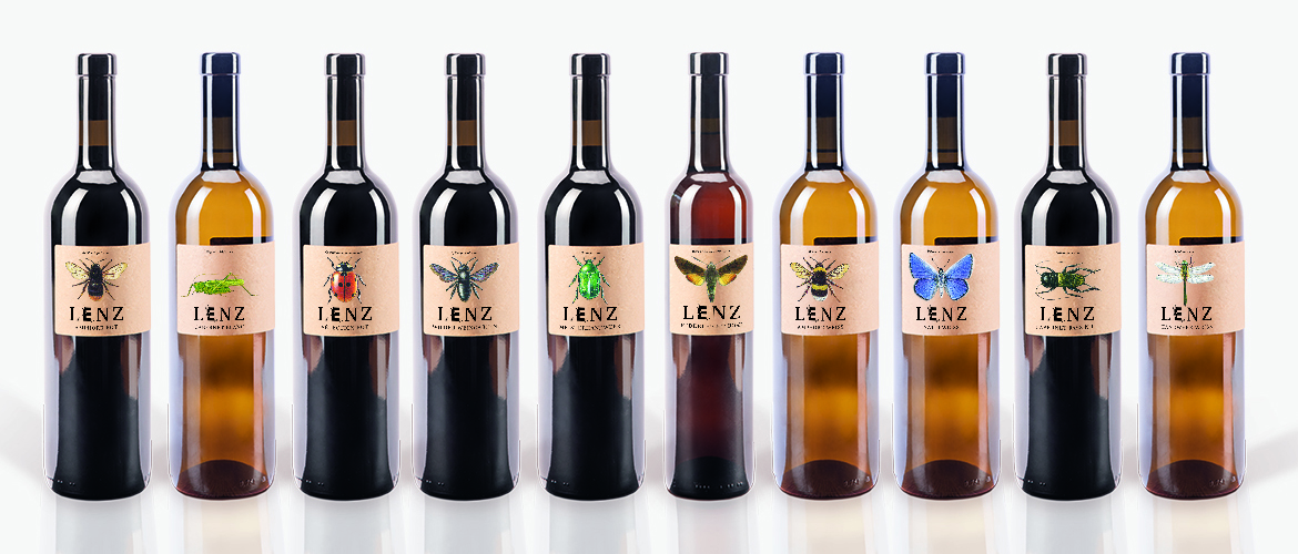 Das Weingut auf dem Iselisberg ist führend in der Herstellung von Weinen, die auf Biodiversität achten. In den Rebbergen des Betriebes sind viele verschiedene Pflanzen und Tiere heimisch. Diese einzigartige Geschichte haben wir bei der Kreation des Corporate Designs und der Etiketten von Lenz zu erzählen versucht. Vom Buchstaben E im Logo verteilen sich kleine Partikel in die Umgebung. Das spielt auf die Verbreitung von Pflanzen und Tieren an, die durch die Anbaumethoden gefördert wird. Auf den Etiketten sind schliesslich eine vielzahl der Insekten abgebildet, die in den Rebbergen von Lenz leben.